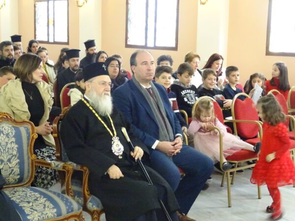 Όπως κάθε χρόνο έτσι κι εχθές Πέμπτη, 2 Ιανουαρίου 2020, από το πρωί, που ξεκίνησε η προσέλευση, επεκράτησε εορταστικό κλίμα και ατμόσφαιρα οικογενειακής θαλπωρής. Ο Σεβασμιώτατος Μητροπολίτης κ. Διονύσιος και ο Πρωτοσύγκελλος, Βοηθός Επίσκοπος Κεγχρεών κ. Αγάπιος καλωσόρισαν με πατρική αγάπη, στοργή και ουσιαστικό ενδιαφέρον τα παιδιά, τα οποία εισέπραξαν αφειδώς τα συναισθήματα αυτά και τα ανταπόδωσαν ψάλλοντας τα κάλαντα, Χριστουγεννιάτικους ύμνους και τραγουδώντας εορταστικά τραγούδια, υπό την βοήθεια της Πρεσβυτέρας-Δασκάλας κ. Παυλίνας Χαμάλη.