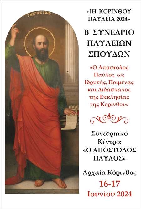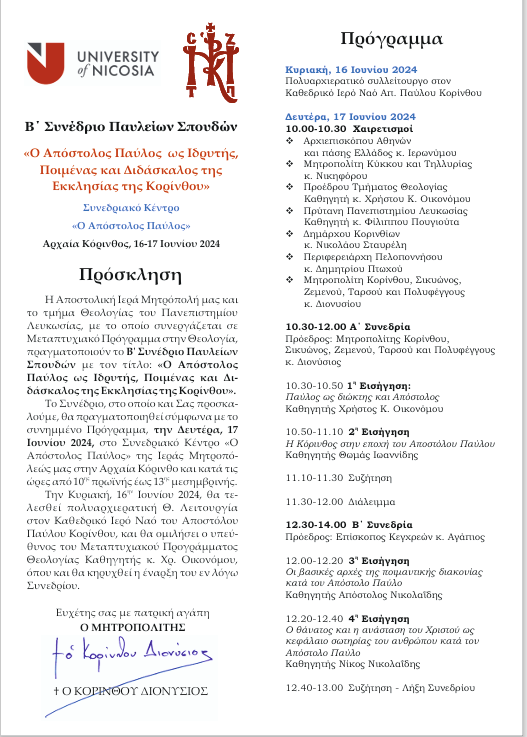12/06/2024 12/06/2024 Η Αποστολική Ιερά Μητρόπολη Κορίνθου και το τμήμα Θεολογίας, του Πανεπιστημίου Λευκωσίας, στο πλαίσιο της συνεργασίας τους για Μεταπτυχιακές και Διδακτορικές Σπουδές στην Θεολογία και με την ευκαιρία των Εκδηλώσεων «ΙΗ’ ΚΟΡΙΝΘΟΥ ΠΑΥΛΕΙΑ 2024», πραγματοποιούν το διήμερο Κυριακή 16 και Δευτέρα 17 Ιουνίου 2024 το Β’ Συνέδριο Παυλείων Σπουδών με τόν τίτλο: «Ο Απόστολος Παύλος...