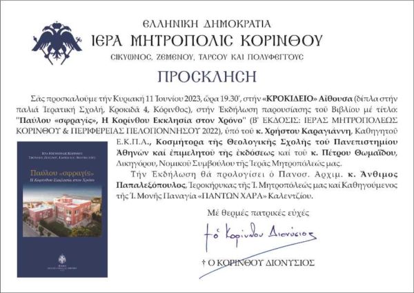 Την Κυριακή, 11 Ιουνίου 2023, στο πλαίσιο των εορταστικών εκδηλώσεων «ΙΖ’ Κορίνθου Παύλεια 2023», στην Κόρινθο, στις 19:30, θα πραγματοποιηθεί παρουσίαση του βιβλίου “Παύλου «σφραγίς», Η Κορίνθου Εκκλησία στον Χρόνο”, το οποίο εξέδωσε για δεύτερη φορά επαυξημένο και συμπληρωμένο η Ιερά Μητρόπολη Κορίνθου με δαπάνη της Περιφέρειας Πελοποννήσου.