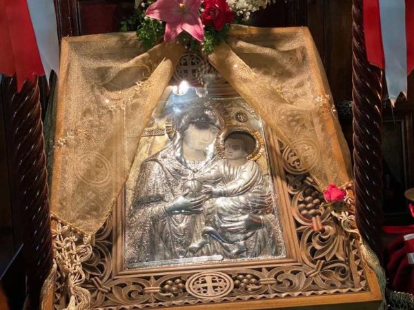 Πριν την λιτάνευση της Ι. Εικόνος, πέριξ της Ι. Μονής, ο Θεοφιλέστατος ομίλησε προς την Ι. Αδελφότητα και στους ευσεβείς προσκυνητές αναφερόμενος στην μνήμη των εγκαινίων του Ναού της Υπεραγίας Θεοτόκου, της Ζωοδόχου Πηγής, στην Κωνσταντινούπολη. Στην συνέχεια αναφέρθηκε στα πολλά θαύματα της Υπεραγίας Θεοτόκου επισημαίνοντας ότι το κατεξοχήν θαύμα είναι η Ίδια, αφού ως άνθρωπος γέννησε τον Θεό, ούσα Παρθένος και Αγνή, παραμένουσα Αειπάρθενος μετά τον θάνατό Της και αεί ζώσα και πρεσβεύουσα υπέρ του ανθρωπίνου γένους. Δέεται η Παναγία μας πάντοτε υπέρ της σωτηρίας των ψυχών μας αρκεί να έχουμε ειλικρινή μετάνοια, να εξομολογούμεθα τις αμαρτίες μας και να πορευόμεθα στον βίο μας σύμφωνα με τις εντολές του Υιού Της. Ολοκληρώνοντας, μετέφερε τις ευχές του σεπτού Ποιμενάρχου κ. Διονυσίου και παρότρυνε την Γερόντισσα Ευαγγελία Μοναχή, την Ι. Αδελφότητα και τους ευσεβείς πιστούς να προσεύχονται στην Θεοτόκο να χαρίζει υγεία, φώτιση, πλούσια τα ελέη του Μονογενούς Της Υιού, κυρίως όμως την αιωνιότητα και τον Παράδεισο!