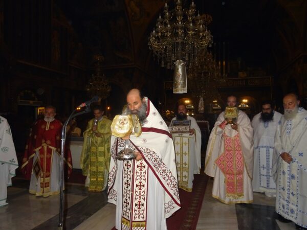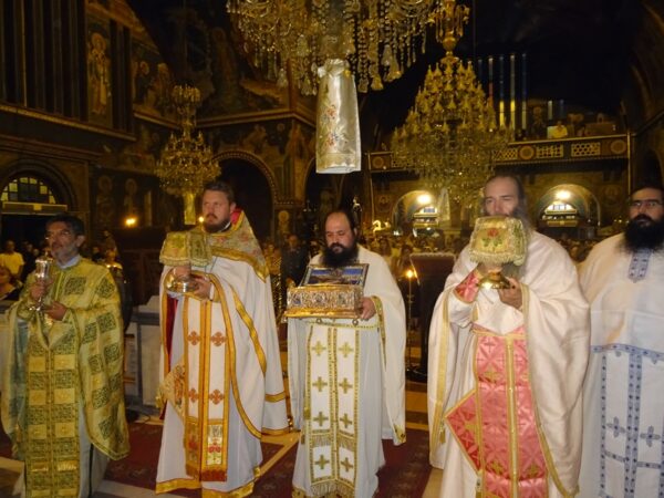 Πριν την απόλυση της Ιεράς Αγρυπνίας ο Σεβ. Μητροπολίτης κ. Διονύσιος, συγκινημένος από την αθρόα προσέλευση των Πιστών για να ασπασθούν την Τιμία Ζώνη της Θεοτόκου και τα Ιερά Λείψανα των εν Κορίνθω Αγίων, απηύθυνε για ακόμη μία φορά θερμές ευχαριστίες προς τον Καθηγούμενο της Ι. Μεγίστης Μονής Βατοπαιδίου Πανοσ. Αρχιμ. Γέροντα κ. Εφραίμ και την υπ’ αυτόν Ι. Αδελφότητα για την ύψιστη τιμή και την μεγίστη ευλογία να κομίσουν την Αγία Ζώνη της Θεοτόκου στην πόλη μας και την Μητροπολιτική Επαρχία.