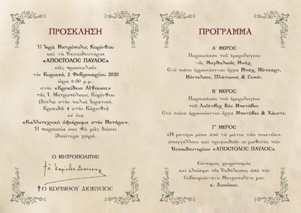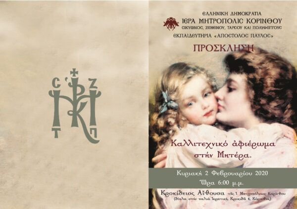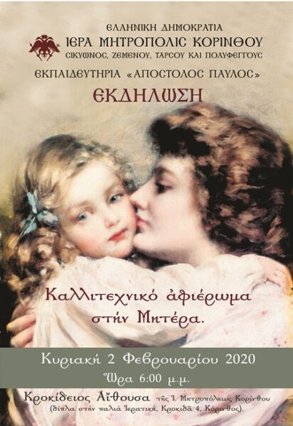 Με την ευκαιρία της Εορτής της Υπαπαντής του Κυρίου, ημέρα κατά την οποία Εκκλησιαστικώς τιμάται το πρόσωπο της «Μητέρας», η Ι. Μητρόπολις Κορίνθου και τα Εκπαιδευτήρια «ΑΠΟΣΤΟΛΟΣ ΠΑΥΛΟΣ» διοργανώνουν επίκαιρη Εκδήλωση, την Κυριακή 2 Φεβρουαρίου 2020 και ώρα 6:00 μ.μ., στην «Κροκίδειο» Αίθουσα (δίπλα στην παλιά Ιερατική, Κροκιδά 4) στην Κόρινθο, με θέμα: «Καλλιτεχνικό Αφιέρωμα στην Μητέρα».