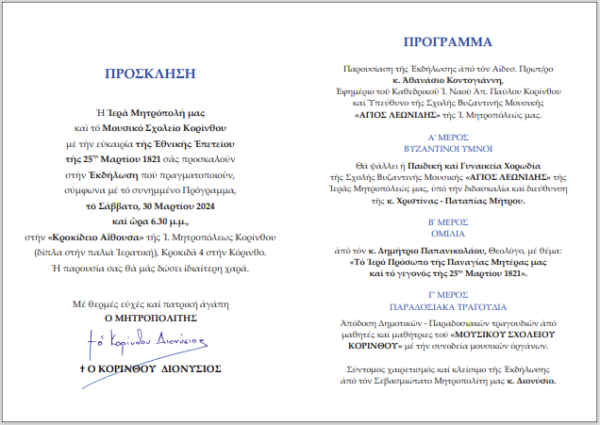 Με αφορμή την Εθνική επέτειο της Παλιγγενεσίας του 1821 το Σάββατο, 30 Μαρτίου 2024 και ώρα 6:30 το απόγευμα, στην «Κροκίδειο» Αίθουσα (παραπλεύρως του Επισκοπείου), η Σχολή Βυζαντινής Μουσικής της Ιεράς Μητροπόλεως και το Μουσικό Σχολείο Κορίνθου διοργανώνουν Εκδήλωση με ομιλητή τον Θεολόγο, κ. Δημήτριο Παπανικολάου, με θέμα: «Το Ιερό Πρόσωπο της Παναγίας Μητέρας μας και το γεγονός της Εθνικής Επετείου της 25ης Μαρτίου 1821».