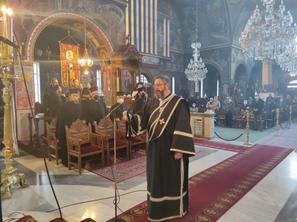 Στον λόγο του ο Σεβασμιώτατος ερμήνευσε την Ευαγγελική Περικοπή της Δ΄ Κυριακής των Νηστειών επισημαίνοντας ότι διανύουμε την Μεγάλη Τεσσαρακοστή, το στάδιο των πνευματικών αγώνων, και καλούμαστε να διεξάγουμε πόλεμο με τον αντίδικο μας διάβολο, ο οποίος προσπαθεί να μας παρασύρει στην πτώση και την αμαρτία, οδηγώντας μας από το αληθινό φως «το φωτίζον και αγιάζον πάντα άνθρωπον ερχόμενον εις τον κόσμον» στο σκοτάδι και την κόλαση.