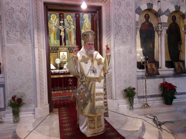 Μετά το πέρας της Θ. Λειτουργίας ο Ποιμενάρχης μίλησε για την μεγάλη εορτή των Θεοφανείων και την έννοια του Βαπτίσματος, τονίζοντας ότι ο Άγιος Ιωάννης ο Πρόδρομος και Βαπτιστής έδιδε το βάπτισμα της μετανοίας και της άφεσης των αμαρτιών προετοιμάζοντας τους ανθρώπους για τον ερχομό του Μεσσία. Η Εκκλησία με το Βάπτισμα, στο όνομα της Αγίας Τριάδας, εισάγει τον νεοφώτιστο στην συμμετοχή του θανάτου και της Αναστάσεως του Ιησού Χριστού. Ο νεοφώτιστος με την βάπτιση αποθέτει τον παλαιόν άνθρωπο και εξέρχεται από το Μυστήριο αναγεννημένος «ἐν Πνεύματι Ἁγίῳ» ενδεδυμένος τον νέο, τον ανακαινισμένο άνθρωπο, τον άνθρωπο που είναι έτοιμος να αντιμετωπίσει κάθε πειρασμό. Περαίνοντας τον λόγο του επεσήμανε ότι εμείς οι Ορθόδοξοι Χριστιανοί με την συμμετοχή μας στο Ι. Μυστήριο της εξομολογήσεως μπορούμε να ξεπλυθούμε από το βάρος των μετά το Βάπτισμα αμαρτιών μας ανανεώνοντας την χάρη του Αγίου Βαπτίσματος και με την αγάπη, την ελεημοσύνη και γενικότερα την τήρηση των Ευαγγελικών αρετών έχουμε την ελπίδα της Ζωής της Αιωνίου και της απολαύσεως των Αγαθών «ἃ ἡτοίμασεν ὁ Θεὸς … (Α΄ Κορ. β, 9) … τοῖς ἠγαπηκόσι τὴν ἐπιφάνειαν αὐτοῦ. (Β΄Τιμ. δ, 8)».