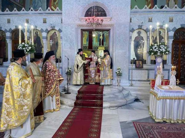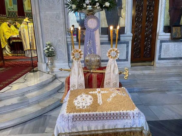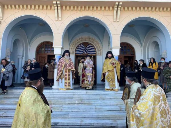 Την Πανηγυρική Θ. Λειτουργία τέλεσε, με την ευλογία του Σεβ. Μητροπολίτου Κορίνθου κ. Διονυσίου, στην οποία και παρέστη συμπροσευχόμενος, ο Θεοφιλέστατος Πρωτοσύγκελλος της Ι. Μητροπόλεως Επίσκοπος Κεγχρεών κ. Αγάπιος πλαισιούμενος από τον Ιεροκήρυκα της Ι. Μητροπόλεως μας Πανοσ. Αρχιμ. π. Άνθιμο Παπαλεξόπουλο, τους Ιερείς του Ναού Πανοσ. Αρχιμ. π. Δαμασκηνό Γεννηματά, Αιδεσ. Πρωτ/ρους π. Γρηγόριο Θεοδώρου, συνταξιούχο Κληρικό της Ι. Μητροπόλεως μας, π. Παναγιώτη Μαυραγάνη, π. Αθανάσιο Κοντογιάννη και τους Διακόνους π. Χρήστο Χίλια και π. Άγγελο Σαλάτα.