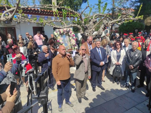 Μετά το πέρας της Θ. Λειτουργίας πραγματοποιήθηκε η Λιτάνευση της Ι. Εικόνος του Αγίου Γεωργίου, της οποίας προηγούντο έφιπποι πιστοί, μεταξύ των οποίων και γυναίκες, με εικόνες του Αγίου στα χέρια τους, συνεχίζοντας την παράδοση του «εθίμου των καβαλάρηδων» και προσδίδοντας μια ξεχωριστή, παραδοσιακή νότα στην εορτή του Τροπαιοφόρου καβαλάρη Αγίου.
