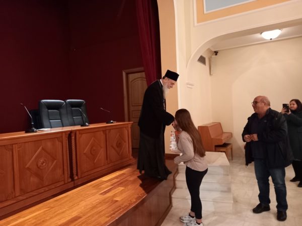 Ο Διευθυντής του Σχολείου κ. Σταυρόπουλος ευχαρίστησε τον Ποιμενάρχη για την ολοκλήρωση της επισκέψεως και τα πατρικά του λόγια και οι μαθητές του προσέφεραν εις ένδειξη αγάπης ένα συμβολικό δώρο.