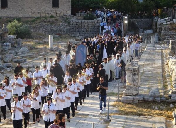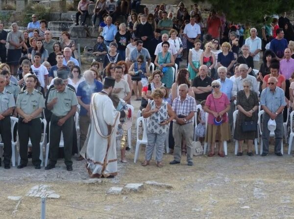 Εκεί, επί του Βήματος της Αγοράς της Αρχαίας Κορίνθου, όπου προπηλακισθείς ο Απ. Παύλος οδηγήθηκε να απολογηθεί στον Ρωμαίο Ανθύπατο της Αχαΐας Γαλλίωνα, και σε ειδικά επ’ αυτού διαμορφωμένη εξέδρα, τελέστηκε κι’ εφέτος ο Μέγας Πολυαρχιερατικός Εσπερινός χοροστατούντος του Σεβ. Μητροπολίτου Γλυφάδας κ. Αντωνίου, και συγχοροστατούντων του Σεβ. Μητροπολίτου Χαλκίδος κ. Χρυσοστόμου, του Θεοφιλεστάτου Επισκόπου Κεγχρεών κ. Αγαπίου και του Σεβ. Ποιμενάρχου μας κ. Διονυσίου.