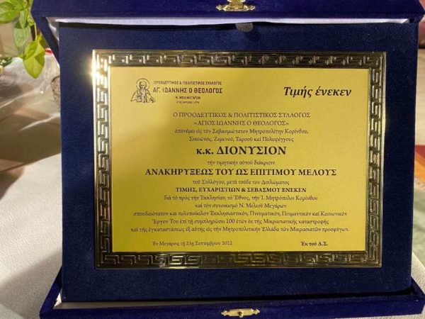 Εν συνεχεία η Πρόεδρος του Συλλόγου «Άγιος Ιωάννης ο Θεολόγος» κ. Ελευθερία Ρίτσα Καλαϊτζή προσφώνησε με θερμούς λόγους επαινώντας τον για το πολυσχιδές έργο του και τίμησε τον Μελιώτη Μητροπολίτη Κορίνθου , ανακηρύσσοντάς τον επίτιμο μέλος του προσφέροντας τιμητικώς αναμνηστική πλακέτα και Αρχιερατικό εγκόλπιο με την εικόνα του Αγίου Ιωάννου του Θεολόγου.