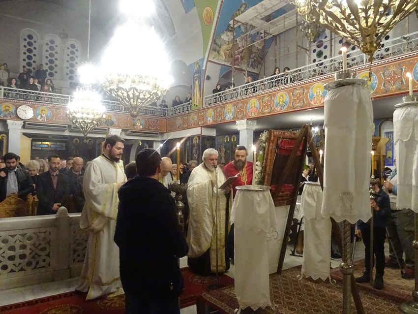 Στον Ι. Ναό Κοιμήσεως της Θεοτόκου Ιωνίας (Συνοικισμού) Κορίνθου χοροστάτησε ο Σεβ. Μητροπολίτης Κορίνθου κ. Διονύσιος την Παρασκευή, 5 Απριλίου 2019, στην Ι. Ακολουθία των Δ΄ Χαιρετισμών πλαισιούμενος από τους συνοδούς του Κληρικούς και τους Εφημέριους του Ι. Ναού.