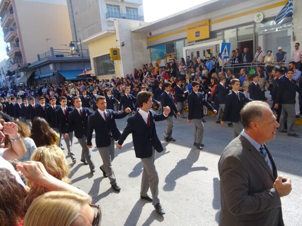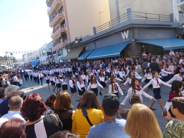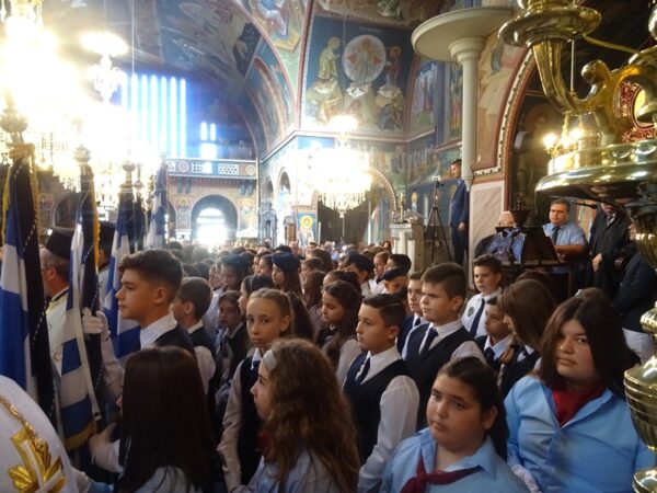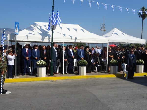 Εν συνεχεία και μετά το επιμνημόσυνο Τρισάγιο στο Ηρώον, στον περίβολο του Καθεδρικού Ι. Ναού του Απ. Παύλου και μετά τις καταθέσεις Στεφάνων, ο Σεβασμιώτατος μετέβη στον προκαθορισμένο τόπο, όπου και παρακολούθησε την Μαθητική και Στρατιωτική Παρέλαση.