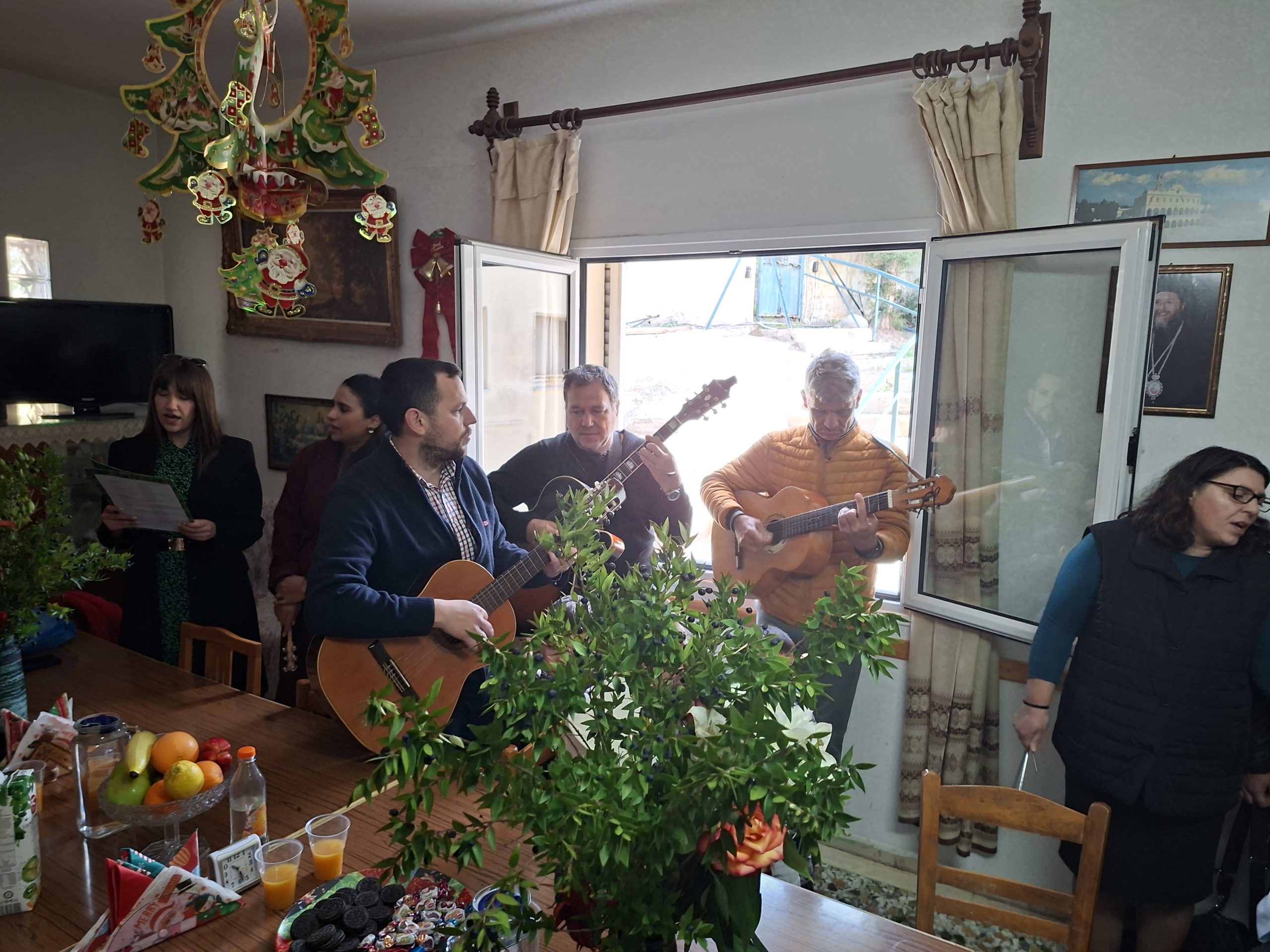 Μαζί του ήταν και μαθητές του Κατηχητικού Σχολείου Κοιμήσεως της Θεοτόκου Ιωνίας (Συνοικισμού) Κορίνθου, οι οποίοι έψαλλαν τα κάλαντα.