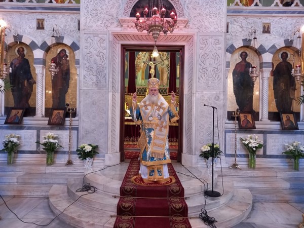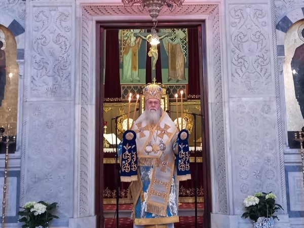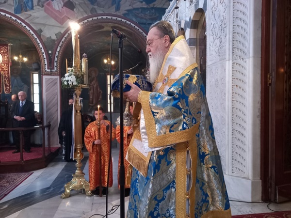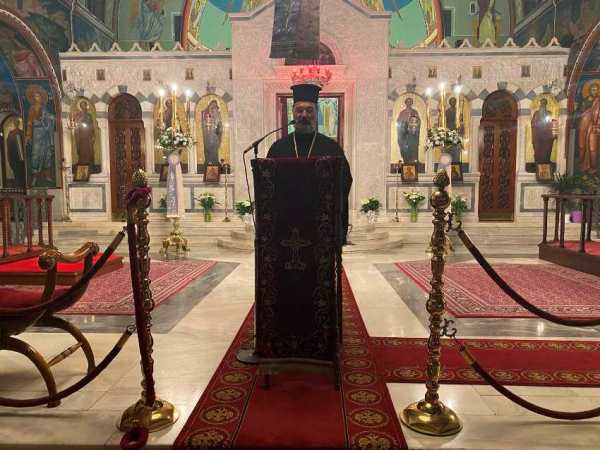 Στο σύντομο κήρυγμά του αναφέρθηκε στα δώρα της αγαθότητος του Θεού· στην ελευθερία του ανθρωπίνου γένους εκ της αμαρτίας και των συνεπακόλουθων αυτής, δια της ενσάρκου Οικονομίας του Κυρίου ημών Ιησού Χριστού, στην τιμή της ανθρωπίνης φύσεως «δια της συγκράσεως» με την ένωση κτιστού και ακτίστου αλλά και στην απελευθέρωση του Γένους μας από την επί τέσσερεις και πλέον αιώνες υποδούλωσή του κάτω από τον Οθωμανικό ζυγό. Συνεργός στην απολαβή μας και στο απόλαυσμά μας των ως άνω δώρων υπήρξε η Θεοτόκος Μαριάμ ως υπουργήσασα στο μυστήριο της Θείας Ενανθρωπήσεως του Δευτέρου Προσώπου της Αγίας Τριάδος και ως Υπέρμαχος Στρατηγός του Έθνους μας διαχρονικά, γι᾿ αυτό και οφείλουμε χάριτες, ευχαριστίες, άπειρη ευγνωμοσύνη, αποδίδοντες δόξα και τιμή στο Θεομητορικό Της Πρόσωπο.