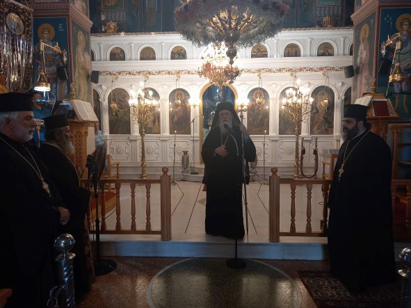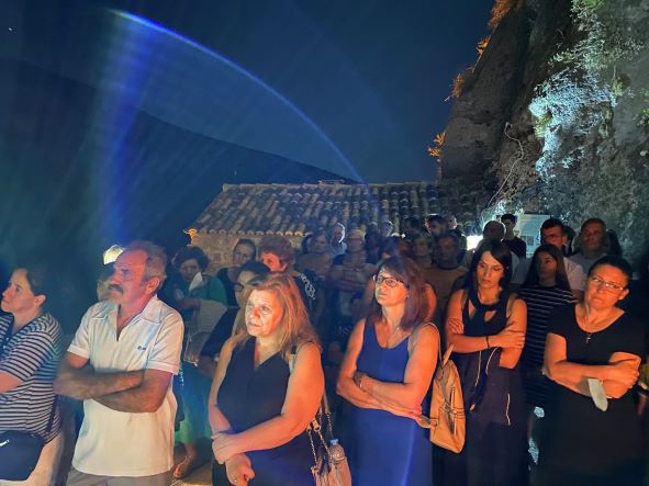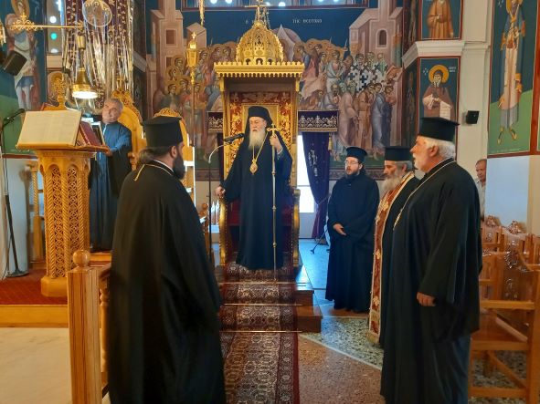 Ο Σεβασμιώτατος στο κήρυγμά του αναφέρθηκε στα γεγονότα που έλαβαν χώρα κατά την Θεία Μεταμόρφωση του Χριστού στο όρος Θαβώρ, τα οποία θυμόμαστε αυτές τις ημέρες που ετοιμαζόμαστε να εορτάσουμε την Κοίμηση της Παναγίας μας, καθώς ψάλλουμε στο Απολυτίκιο Της: «ἐν τῇ Κοιμήσει τὸν κόσμον οὐ κατέλιπες Θεοτόκε». Αναζητούμε την Παναγία μας, ειδικά εμείς οι Έλληνες, όπου υπάρχει Θεομητορικό Σέμνωμα, όπως εδώ στην Ιστορική Ιερά Μονή Της. Μακάρι η παρουσία Της να μας οδηγήσει να εορτάσουμε και το φετινό Πανηγύρι όσο το δυνατόν πιο πνευματικά, Ορθόδοξα και Ελληνικά γίνεται, καθώς τα βάσανα, οι καημοί, οι αρρώστιες, οι πόλεμοι και τα προβλήματα μας έχουν κυκλώσει σαν μέλισσες. Ο Ποιμενάρχης μας ολοκλήρωσε την ομιλία του αναφερόμενος στον Ιεροκήρυκα και Ηγούμενο της Ι. Μονής Παναγίας του Βράχου Νεμέας Πανοσ. Αρχιμ π. Θεόκλητο Φραγκιουδάκη, ο οποίος αδιάκοπα επί πενήντα χρόνια, παρά τις δυσκολίες δεν παραλείπει να ανάβει το καντήλι και να θυμιάζει την Παναγία μας, κρατώντας ζωντανό αυτό το Μοναστήρι, δίνοντάς του την ευχή η Παναγία μας να τον ενδυναμώνει στον αγώνα του!