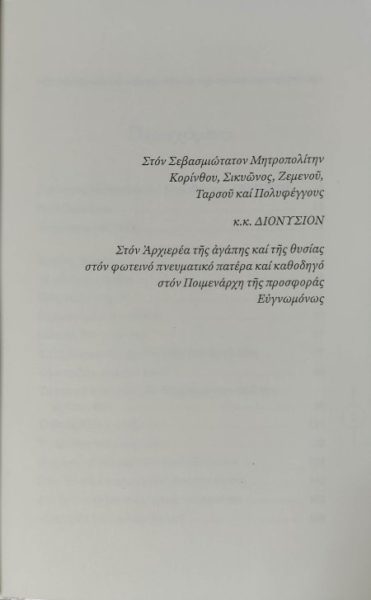 Το βιβλίο είναι αφιερωμένο τιμητικώς στον Σεβασμιώτατο Μητροπολίτη Κορίνθου κ. Διονύσιο.