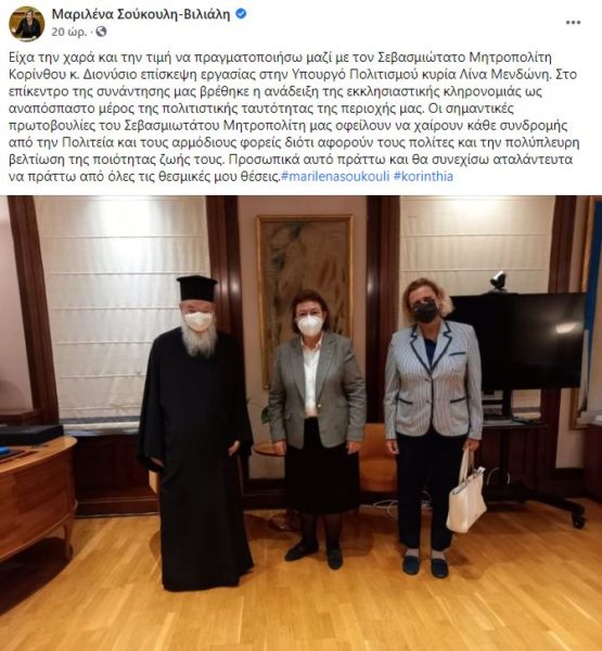 “Είχα την χαρά και την τιμή να πραγματοποιήσω μαζί με τον Σεβασμιώτατο Μητροπολίτη Κορίνθου κ. Διονύσιο επίσκεψη εργασίας στην Υπουργό Πολιτισμού κυρία Λίνα Μενδώνη. Στο επίκεντρο της συνάντησης μας βρέθηκε η ανάδειξη της εκκλησιαστικής κληρονομιάς ως αναπόσπαστο μέρος της πολιτιστικής ταυτότητας της περιοχής μας.