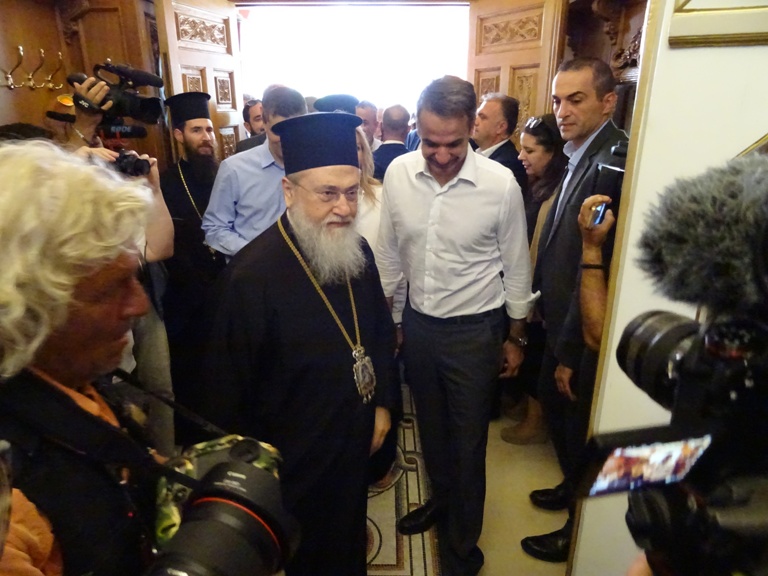 Ο κ. Μητσοτάκης κατέφθασε στο Επισκοπείο περί τις 9:30 το πρωί συνοδευόμενος από την σύζυγό του κ. Μαρέβα Μητσοτάκη, τον βουλευτή του Νομού κ. Χρήστο Δήμα και τους υπολοίπους επιτελείς του. Στην Αίθουσα του θρόνου του Επισκοπείου εκτός από τον Μητροπολίτη τον υποδέχθηκαν ο Θεοφ. Επίσκοπος Κεγχρεών κ. Αγάπιος, Πρωτοσύγκελλος και άπαντες οι Κληρικοί και λαϊκοί υπάλληλοι των Γραφείων της Ι. Μητροπόλεως.
