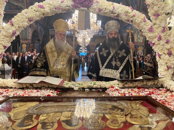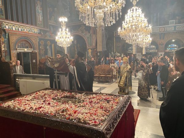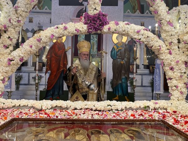 Ο Μητροπολίτης Κορίνθου κ. Διονύσιος, πλαισιούμενος από τον Θεοφιλέστατο Επίσκοπο Κεγχρεών κ. Αγάπιο, χοροστάτησε στον Καθεδρικό Ι. Ναό Απ. Παύλου Κορίνθου και αμέσως μετά ηγήθηκε της Ι. Λιτανείας, που κατέληξε στην Κεντρική Πλατεία της πόλεως Κορίνθου, στην θέση «ΠΕΡΙΒΟΛΑΚΙΑ». Στο σημείο αυτό, όπως είχε προαναγγελθεί, έγινε η καθιερωμένη από τον Σεβασμιώτατο Μητροπολίτη κ. Διονύσιο συνάντηση των έξι Επιταφίων των Ι. Ναών της πόλεως Κορίνθου και συγκεκριμένα των Ι. Ναών Αποστόλου Παύλου, Αγ. Νικολάου, Αγ. Άννης, Μεταμορφώσεως Σωτήρος, Αγ. Φωτεινής και Ζωοδόχου Πηγής Α’ Κοιμητηρίου Κορίνθου, που με μεθοδικότητα και άριστη διοργάνωση είχε σχεδιασθεί σε σύσκεψη όλων των Αρχών της πόλεως, στα γραφεία της Ιεράς Μητρόπολης, υπό τον σεπτό Ποιμενάρχη.