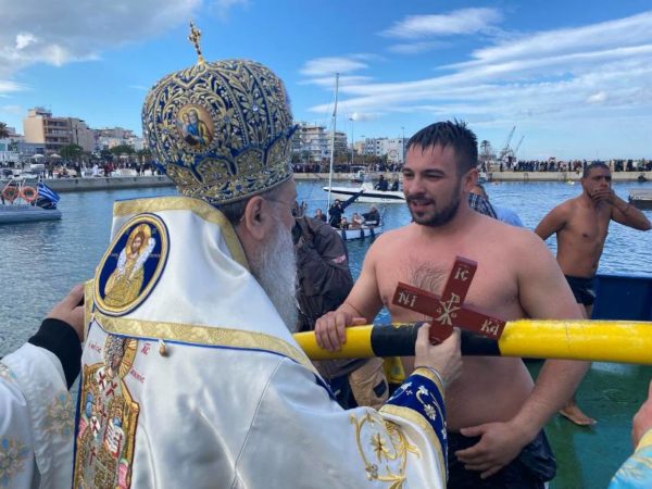 Στην συνέχεια και σύμφωνα με το πρόγραμμα, που κατάρτισε ο Δήμος Κορινθίων, ξεκίνησε, υπό τον παιανισμό της Φιλαρμονικής του Δήμου Κορινθίων και υπό την συνοδεία αγήματος της Σχολής Μηχανικού, λιτανευτική πομπή προς τον «Φλοίσβο», το Κεντρικό Λιμάνι της Κορίνθου, όπου και περίμενε σκάφος (ευγενική προσφορά) της «Διώρυγας Κορίνθου», στο οποίο επιβιβάσθηκαν ο Σεβ. Ποιμενάρχης μας και ο Ιερός Κλήρος προκειμένου να πραγματοποιηθεί η Κατάδυση του Τιμίου Σταυρού στα θαλάσσια νερά του Κορινθιακού. Τον Τίμιο Σταυρό ανέσυρε, μετά από έντονο συναγωνισμό 46 κολυμβητών όλων των ηλικιών ο 23χρονος Κορίνθιος κ. Φίλιππος Πολυδωρόπουλος, ο οποίος έλαβε ως ευλογία από τον Μητροπολίτη μας έναν χρυσό σταυρό και ένα μπουρνούζι οι υπόλοιποι κολυμβητές έλαβαν αντιστοίχως από έναν ασημένιο σταυρό και ένα μπουρνούζι. Η τελετή ολοκληρώθηκε με τις ευχές, την ευλογία και τις θερμές ευχαριστίες του Σεβ. Μητροπολίτου μας κ. Διονυσίου προς τις Αρχές, τον Κλήρο και τον Λαό, που ανταποκρίθηκαν στο κάλεσμα της Τοπικής μας Εκκλησίας και συμμετείχαν για ακόμη μία χρονιά πάνδημα στον εορτασμό των Θεοφανείων.