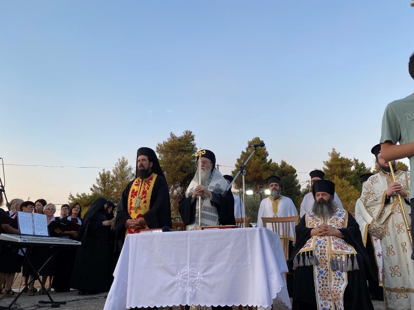 Αναφερθείς στον χώρο συνάξεως των Προσκυνητών τόνισε ότι παρευρίσκονται σ᾿ ένα Μοναστήρι που είναι, όπως κάθε Μοναστήρι, «φροντιστήριο ψυχών» και «εργαστήριο αγιότητος». Είναι ένας χορός «αγίων» -με την έννοια των αφιερωμένων στον Θεό-, μια μεγαλοπρεπής πανήγυρις που λατρεύει τον Θεό. Κάθε Μοναστήρι είναι μια «πομπή» μια «λιτανεία», μία «πορεία» προς την Βασιλεία του Θεού, στην οποία οι θυσίες των καρδιών, μέσα από το Μοναχικό τρίπτυχο των αρετών της υπακοής, της παρθενίας και της ακτημοσύνης, είναι αδιάλειπτες και μαρτυρούν την «εν πνεύματι και αληθεία» προσκύνηση του Θεού. Και με αναφορά στην κατάθεση της Κιβωτού της Διαθήκης στον Ναό του Σολομώντος (Γ’ Βας. η’, 1 και εξής), που έγινε με λιτανεία και θυσίες προβάτων και βοών αναριθμήτων παρουσίασε και το «στίγμα» της Ι. Λιτανείας -έστω και μικρής- που προηγήθηκε. Η Κιβωτός της Διαθήκης υπήρξε η κατ’ εξοχή προτύπωση της Θεοτόκου, αφού ήταν ο τόπος της φανερώσεως του Θεού, της παρουσίας Του μεταξύ των ανθρώπων πριν την Σάρκωση του Λόγου.