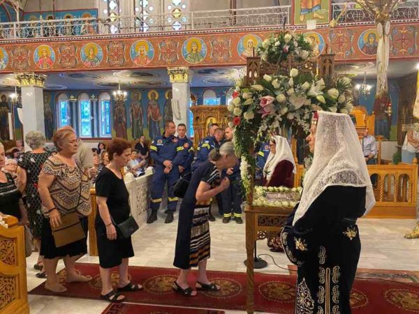 Αμέσως μετά τον Εσπερινό τελέστηκε η λιτανευτική πομπή του Επιταφίου της Παναγίας μας τον Οποίο πήραν στους ώμους τους εθελοντές πυροσβέστες.