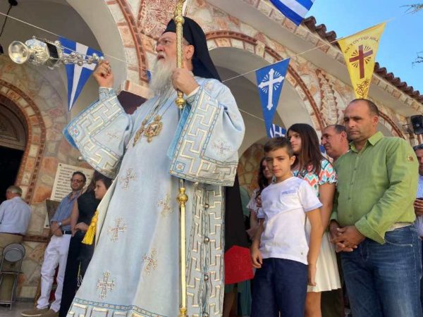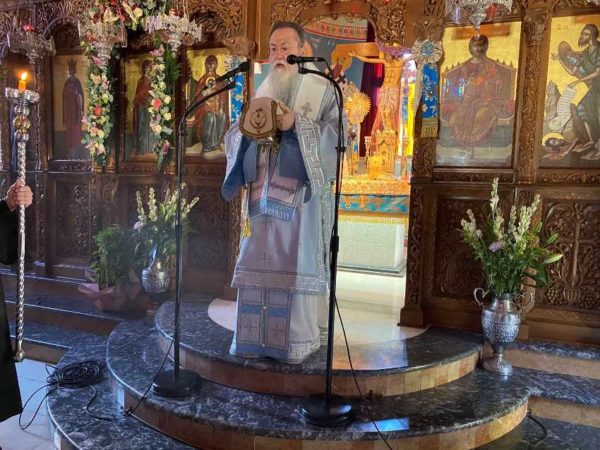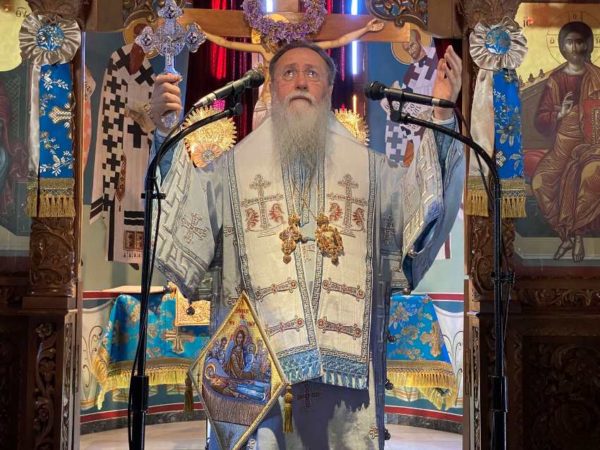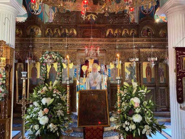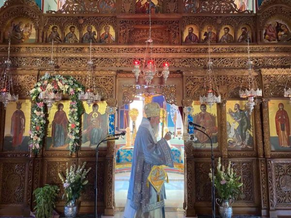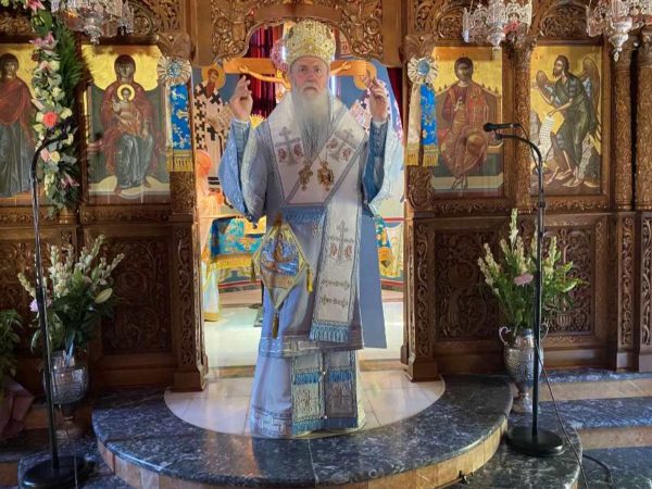Στο κήρυγμα του ο Σεβασμιώτατος τόνισε ότι η Εκκλησία μας προτρέπει να εορτάζουμε τις μεγάλες εορτές της Ορθοδοξίας μας γεμάτοι από φιλανθρωπία. Τα γεγονότα που αφορούν την ζωή της Εκκλησίας δεν είναι τίποτε άλλο από γεγονότα αγάπης του Θεού προς τον άνθρωπο και άρα γεγονότα φιλανθρωπίας. Γι’ αυτό οι Απόστολοι που είναι τα εδραιώματα και οι στύλοι της Εκκλησίας μας συνδυάζουν την θεωρία με την πράξη και δη ο Απόστολος Ιάκωβος ο Αδελφόθεος λέει «δεῖξόν μοι τὴν πίστιν σου ἐκ τῶν ἔργων σου» (Ιακ. β’, 18). Ο Θεός, που από άπειρη αγάπη και φιλανθρωπία έγινε άνθρωπος, και με την θυσία Του έσωσε τον άνθρωπο και του έδωσε Ζωή και Ανάσταση, δεν στάθηκε στις παιδαγωγικές πράξεις της τηρήσεως του Νόμου αλλά μας έδωσε απλόχερα την χάρι Του, το έλεός Του και την αγάπη Του. Όταν αντιμετωπίζουμε με αγάπη τον συνάνθρωπό μας, όπως ο Χριστός αντιμετώπισε τον μετανιωμένο ληστή που ήταν σταυρωμένος μαζί Του, «ζούμε» τον Παράδεισο. Η Εκκλησία μας καλεί με την μετάνοια, την ταπείνωση και την αγάπη προς τον συνάνθρωπο μας να εισέλθουμε στον Παράδεισο. «Ἐν τούτῳ γνώσονται πάντες ὅτι ἐμοὶ μαθηταί ἐστε, ἐὰν ἀγάπην ἔχητε ἐν ἀλλήλοις» (Ιω. ιγ’, 35) μας λέει ο Κύριος και γνήσια Μαθήτρια του Χριστού υπήρξε η Παναγία μας, η Οποία δέετε, πρεσβεύει και βρίσκεται παντού για να μας βοηθήσει, να μας παρηγορήσει και να μας προσφέρει την Μητρική Προστασία Της.