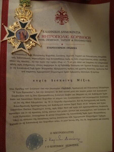 Λίγο πριν την απόλυση, ο Σεβ. Μητροπολίτης μας κ. Διονύσιος ανακήρυξε ως Ευεργέτιδα της Ι. Μητροπόλεως Κορίνθου την τέως Πρόεδρο του Συλλόγου υπό την επωνυμία «Ορθόδοξη Χριστιανική και Πολιτιστική Αδελφότητα «Η Αγία Πρίσκιλλα», κ. Δέσποινα Μέξια, και της επέδωσε τιμητικώς το Παράσημο του Αποστόλου Παύλου, την μέγιστη διάκριση της Αποστολικής Ιεράς Μητροπόλεως Κορίνθου, αναγνωρίζοντας στο πρόσωπό της και την προσφορά του ως άνω Συλλόγου στους Χριστιανούς της Κορίνθου και το επιτελεσθέν μετ᾿ Εκκλησιαστικής φρονήσεως Κατηχητικό και Φιλανθρωπικό έργο αυτού.