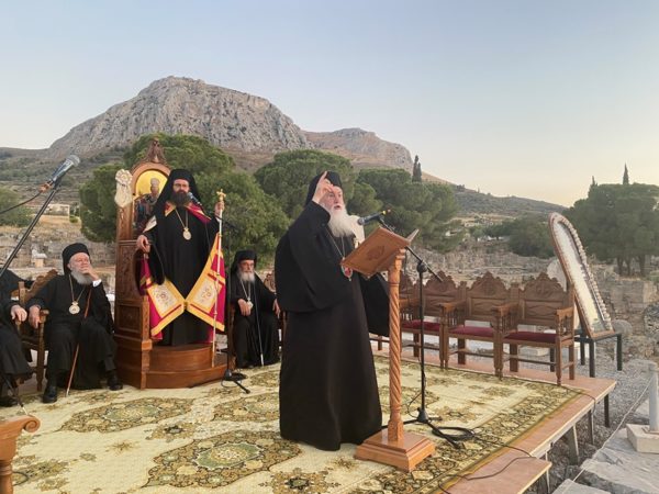 Εκεί, επί του Βήματος της Αγοράς της Αρχαίας Κορίνθου, όπου προπηλακισθείς ο Απ. Παύλος οδηγήθηκε να απολογηθεί στον Ρωμαίο Ανθύπατο της Αχαΐας Γαλλίωνα, και σε ειδικά επ’ αυτού διαμορφωμένη εξέδρα, τελέστηκε κι’ εφέτος ο Μέγας Πολυαρχιερατικός Εσπερινός χοροστατούντος του Θεοφιλεστάτου Επισκόπου Λακεδαιμονίας κ. Θεοφίλου και συγχοροστατούντων των Σεβ. Μητροπολιτών Χαλκίδος κ. Χρυσοστόμου, Ζιχνών και Νευροκοπίου κ. Ιεροθέου, του Θεοφιλεστάτου Επισκόπου, Σκοπέλου κ. Νικοδήμου, ως και του Σεβ. Ποιμενάρχου κ. Διονυσίου.