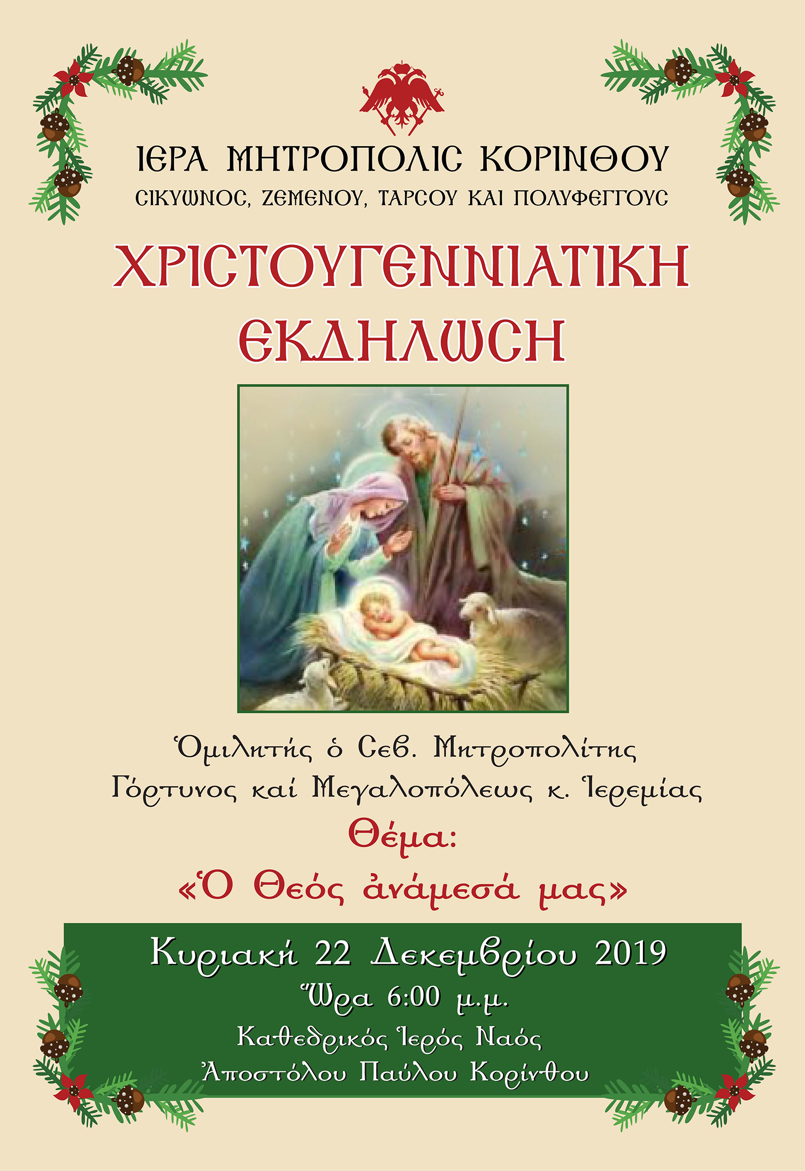 Εορταστική εκδήλωση για τα Χριστούγεννα αναμένεται να πραγματοποιήσει η Ιερά Μητρόπολη Κορίνθου την Κυριακή, 22 Δεκεμβρίου 2019 και ώρα 6:00 μ.μ., στον Καθεδρικό Ι. Ναό Αποστόλου Παύλου Κορίνθου.
