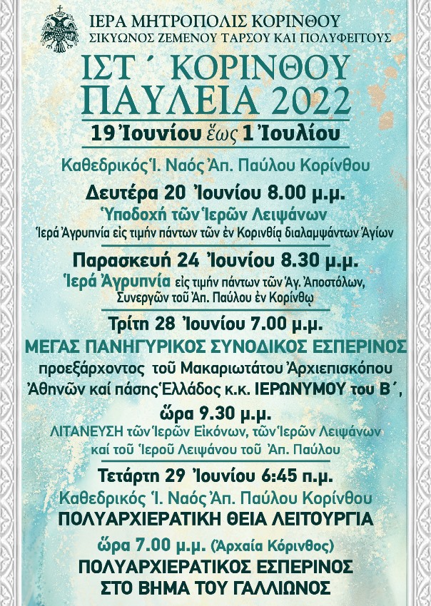 Την Δευτέρα, 20 Ιουνίου 2022, στο πλαίσιο των Εορταστικών Εκδηλώσεων «ΙΣΤ΄ ΚΟΡΙΝΘΟΥ ΠΑΥΛΕΙΑ 2022», στα Προπύλαια του Ι. Ναού Αποστόλου Παύλου στην Κόρινθο στις 20:00 θα πραγματοποιηθεί η Υποδοχή των Ιερών Λειψάνων των Αγίων: Τιμίου Προδρόμου, Αποστόλου Ιάσονος και Ακύλα, Ιερομαρτύρων Διονυσίου Αρεοπαγίτου, Διονυσίου του Α΄ Επισκόπου Κορίνθου και Βλασίου, Αγίων Σωφρονίου Ιεροσολύμων και Μακαρίου Κορίνθου, Μεγαλομάρτυρος Γεωργίου, Αγίας Φωτεινής της Σαμαρείτιδος, των Αγίων Μαρτύρων Κοδράτου και Λεωνίδου και της συνοδείας αυτού, Οσίων Παταπίου, Νίκωνος του Νέου και Οσίας Υπομονής, ως και οι Ιερές Εικόνες, της Παναγίας «ΠΑΡΑΜΥΘΙΑΣ» και πάντων των εν Κορινθία Αγίων.