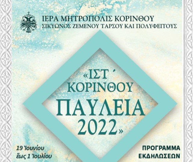 Την Δευτέρα, 20 Ιουνίου 2022, στο πλαίσιο των Εορταστικών Εκδηλώσεων «ΙΣΤ΄ ΚΟΡΙΝΘΟΥ ΠΑΥΛΕΙΑ 2022», στα Προπύλαια του Ι. Ναού Αποστόλου Παύλου στην Κόρινθο στις 20:00 θα πραγματοποιηθεί η Υποδοχή των Ιερών Λειψάνων των Αγίων: Τιμίου Προδρόμου, Αποστόλου Ιάσονος και Ακύλα, Ιερομαρτύρων Διονυσίου Αρεοπαγίτου, Διονυσίου του Α΄ Επισκόπου Κορίνθου και Βλασίου, Αγίων Σωφρονίου Ιεροσολύμων και Μακαρίου Κορίνθου, Μεγαλομάρτυρος Γεωργίου, Αγίας Φωτεινής της Σαμαρείτιδος, των Αγίων Μαρτύρων Κοδράτου και Λεωνίδου και της συνοδείας αυτού, Οσίων Παταπίου, Νίκωνος του Νέου και Οσίας Υπομονής, ως και οι Ιερές Εικόνες, της Παναγίας «ΠΑΡΑΜΥΘΙΑΣ» και πάντων των εν Κορινθία Αγίων.