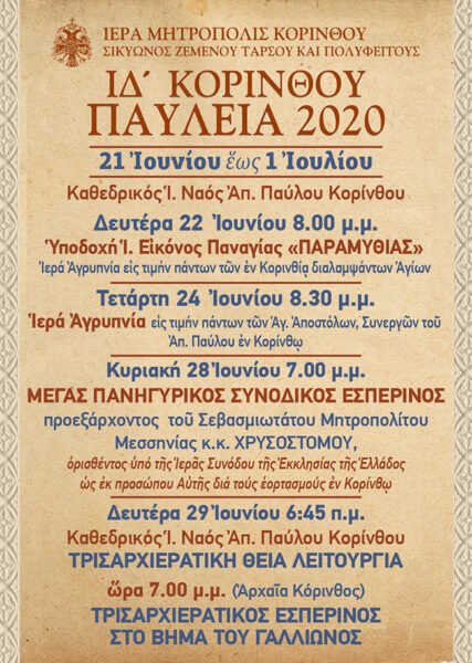 Την Δευτέρα, 22 Ιουνίου 2020, στο πλαίσιο των Εορταστικών Εκδηλώσεων «ΙΔ’ ΚΟΡΙΝΘΟΥ ΠΑΥΛΕΙΑ 2020», στα Προπύλαια του Ι. Ναού Αποστόλου Παύλου στην Κόρινθο και ώρα 8:00΄ μ.μ. θα πραγματοποιηθεί η Υποδοχή του αντιγράφου της Ιεράς Εικόνος της Παναγίας «ΠΑΡΑΜΥΘΙΑΣ» εκ του Μητροπολιτικού Παρεκκλησίου της Αγίας Φωτεινής, όπου φυλάσσεται, και θα ακολουθήσει η «έξοδος» του Ι. Λειψάνου του Απ. Παύλου και η «ενθρόνησις» αυτού επί του προευτρεπισθέντος τετραποδίου. Στην συνέχεια θα τελεσθεί Ι. Αγρυπνία προς τιμήν πάντων των εν Κορινθία διαλαμψάντων Αγίων, προεξάρχοντος του Σεβασμιωτάτου Μητροπολίτου μας κ. Διονυσίου.