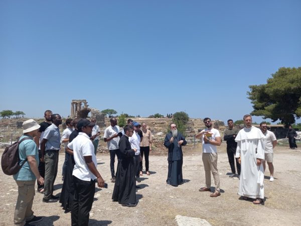 Αμέσως μετά οι φιλοξενούμενοι φοιτητές και ο κ. Καθηγητής μετέβησαν στην Αρχαία Κόρινθο όπου και ξεναγήθηκαν από τον Σεβασμιώτατο Μητροπολίτη Κορίνθου κ. Διονύσιο στους χώρους της Αρχαίας Αγοράς και στο Βήμα του Γαλλίωνος, εντός του Αρχαιολογικού χώρου. Μετά την ξενάγηση παρατέθηκε γεύμα στο Συνεδριακό Κέντρο «ΑΠΟΣΤΟΛΟΣ ΠΑΥΛΟΣ» της Ιεράς Μητροπόλεώς μας στο Ιερό Προσκύνημα των Αγίων Αναργύρων στην Αρχαία Κόρινθο.
