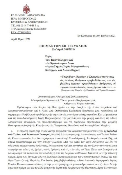 Ποιμαντορική Εγκύκλιο επί τη ενάρξει του Δεκαπενταύγουστου δημοσιεύει ο Σεβασμιώτατος Μητροπολίτης Κυθήρων και Αντικυθήρων κ. Σεραφείμ. Μεταξύ άλλων, αναφέρεται στον εμβολιασμό του πληθυσμού λόγω της πανδημίας του κορονοϊού. “Παρατηρείται”, όπως επισημαίνει, “ένας ανησυχητικός διχασμός του ελληνικού μας λαού σε εμβολιασμένους και ανεμβολίαστους. Εις τους εμβολιασμένους δίδονται προνόμια, ειδικές μεταχειρίσεις και παροχές από το Κράτος, ενώ οι ανεμβολίαστοι απειλούνται με επίσχεσι εργασίας, διακοπή μισθοδοσίας και αναστολή άχρι καιρού της υγιειονομικής των περιθάλψεως, τα οποία αντίκεινται εις τας διατάξεις του Συντάγματος της Χώρας μας και φαλκιδεύουν την συνταγματικήν ελευθερίαν”.