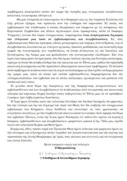 Το μεγάλο αυτό θέμα της διακρίσεως και της διαφορετικής αντιμετωπίσεως των εμβολιασθέντων και των ανεμβολίαστων το αναδεικύουμε από πνευματικής και κοινωνικής πλευράς και κάμνουμε θερμή έκκλησι στους κυβερνώντας το Έθνος μας να το προλάβουν εγκαίρως πριν λάβη τεράστιες διαστάσεις”.