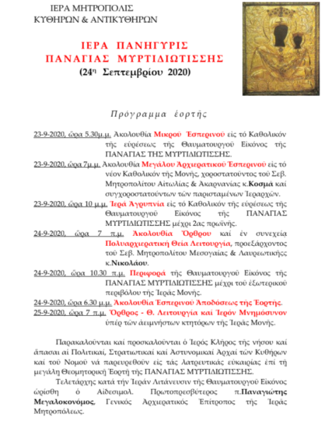 Την 24η Σεπτεμβρίου, η νήσος των Κυθήρων εορτάζει πανδήμως και πανηγυρικώς την Πολιούχο, Έφορο και Προστάτιδα ΠΑΝΑΓΙΑ ΜΥΡΤΙΔΙΩΤΙΣΣΑ στην ομώνυμη Ιερά Μονή. Επισυνάπτεται η Πρόσκλησις και το Πρόγραμμα της εφετινής Ιεράς Πανηγύρεως 2020.