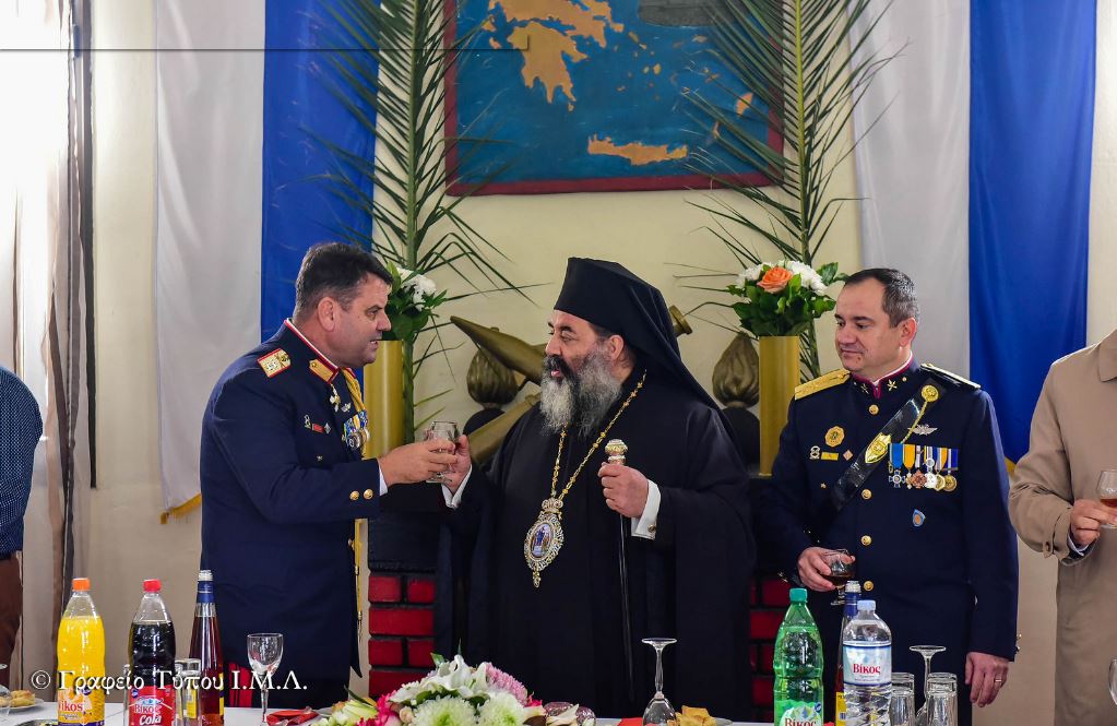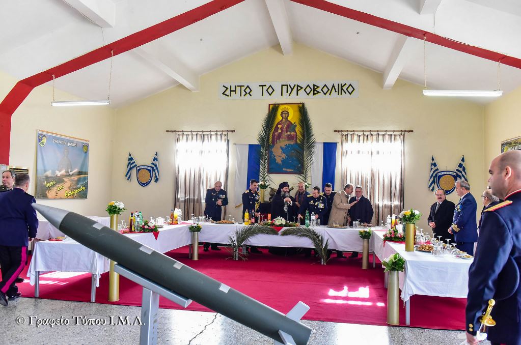 Στον σύντομο χαιρετισμό του ο Σεβασμιώτατος μετέφερε προς όλους τους παρισταμένους τις ευχές της Αγίας μας Εκκλησίας, ενώ ακολούθησε, ξενάγηση στους χώρους του στρατοπέδου και ενημέρωση για τα οπλικά συστήματα τα οποία φιλοξενούνται εις την Στρατιωτική Μονάδα της 194ης ΜΠΕΠ (MLRS), από τον Διοικητή αυτής, Αντισυνταγματάρχη ΠΒ κ. Κώτα Γεώργιο, καθώς επίσης και δεξίωση στο κέντρο ψυχαγωγίας της μονάδος, προς τιμήν των επισήμων καλεσμένων που προσήλθαν να τιμήσουν την προστάτιδα του Πυροβολικού Σώματος του Στρατού Ξηράς.