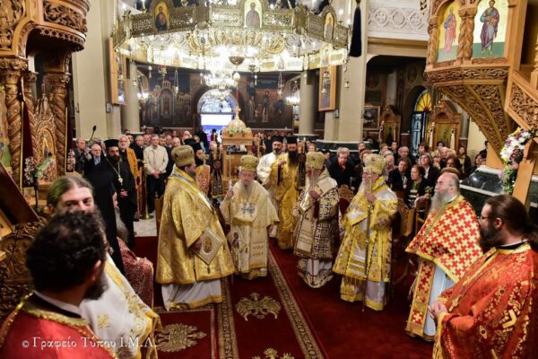Τους Σεβασμιωτάτους Αρχιερείς πλαισίωναν πολλοί Ιερείς και Διάκονοι, με επικεφαλής τον Γενικό Αρχιερατικό Επίτροπο της Ι.Μ.Θ. Πανοσιολ. Αρχιμ. Π. Φώτιο Ζαρζαβατσάκη, ενώ εκ του Ιερού Βήματος παρέστη συμπροσευχόμενος ο Καθηγούμενος της Ι.Μ. Βατοπαιδίου Πανοσιολογιώτατος Αρχιμανδρίτης π. Εφραίμ, ο οποίος και προέστη της χτεσινοβραδινής κατανυκτικής Αγρυπνίας, ομιλώντας στο τέλος επικαίρως προς τους ευλαβείς πιστούς, ενορίτες και προσκυνητές που υπερεπλήρωσαν τον πανσεβάσμιο Ιερό Ναό.
