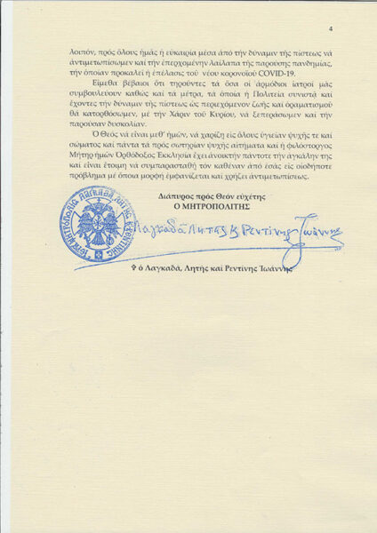“Να γνωρίζουμε, λοιπόν, όλοι ότι πάντοτε η καταφυγή προς το Θεό και πάντοτε η ζωή της Αγίας ημών Εκκλησίας υπήρξε δύναμις αποτρεπτική δια της οποίας ο Θεός θαυματούργησε και χάρισε το επιθυμητό αποτέλεσμα με πολύ συγκεκριμένους και θαυμαστούς τρόπους” αναφέρει, μεταξύ άλλων, σε ποιμαντορική Εγκύκλιο ο Σεβασμιώτατος Μητροπολίτης Λαγκαδά, Λητής & Ρεντίνης κ. Ιωάννης.