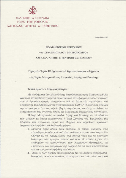 “Να γνωρίζουμε, λοιπόν, όλοι ότι πάντοτε η καταφυγή προς το Θεό και πάντοτε η ζωή της Αγίας ημών Εκκλησίας υπήρξε δύναμις αποτρεπτική δια της οποίας ο Θεός θαυματούργησε και χάρισε το επιθυμητό αποτέλεσμα με πολύ συγκεκριμένους και θαυμαστούς τρόπους” αναφέρει, μεταξύ άλλων, σε ποιμαντορική Εγκύκλιο ο Σεβασμιώτατος Μητροπολίτης Λαγκαδά, Λητής & Ρεντίνης κ. Ιωάννης.