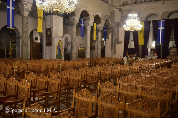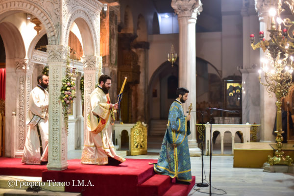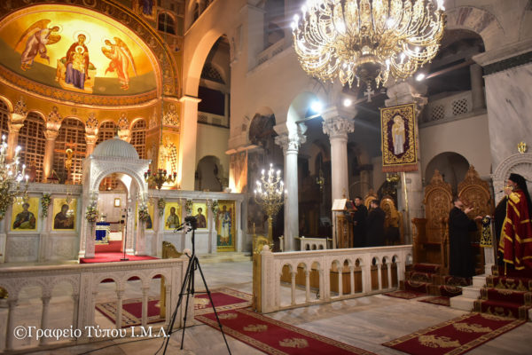 Τον Σεβασμιώτατο κατά τη διάρκεια της κατανυκτικής Ακολουθίας πλαισίωναν Ιερείς και Διάκονοι, ενώ παράλληλα συνεχίζονταν σύμφωνα με τα προβλεπόμενα μέτρα πρόληψης για τον περιορισμό διασποράς του κορωνοϊού, το Προσκύνημα του αντιγράφου της Ιερής Εικόνας της Παναγίας Παραμυθίας και των Σεπτών Λειψάνων του Αγίου Μεγαλομάρτυρος Δημητρίου του Μυροβλύτου.
