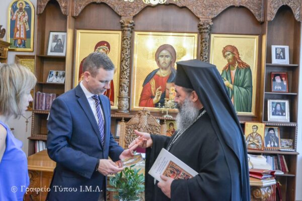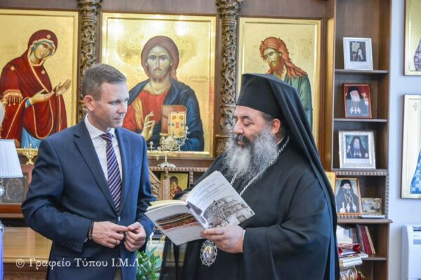Ακολούθησε μικρή ξενάγηση στου χώρους της Μητροπόλεως, ενώ κατά την διάρκεια της ανταλλαγής των εθιμοτυπικών δώρων, ο Σεβασμιώτατος ευχήθηκε στον κ. Πρόξενο την εξ Ύψους δύναμιν προς την καλύτερη και εποικοδομητικότατη επιτέλεσίν των πολυεύθυνων καθηκόντων του, ενώ από την πλευρά του ο κ. Gregory W. Pfleger, Jr., εξέφρασε τις ευχαριστίες του για την θερμή υποδοχή και την εποικοδομητική συζήτηση που προηγήθηκε.