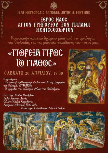Ο Ιερός Ναός Αγίου Γρηγορίου του Παλαμά Μελισσοχωρίου διοργανώνει το Σάββατο 20 Απριλίου στις 7:30 μ.μ. εκδήλωση με θέμα: “Πορεία προς το Πάθος”. Στην εκδήλωση συμμετέχουν το μουσικό, καλλιτεχνικό σύνολο του Ι.Ν. Αγ. Γρηγορίου του Παλαμά “ΕΥΦΩΝΟΝ” και η χορωδία του συλλόγου “Φίλων της Μπάλτζας”.