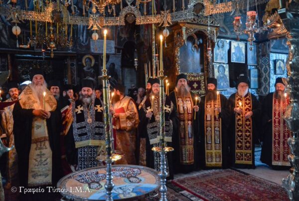 Κατά την διάρκεια της παραμονής του στο Περιβόλι της Παναγίας, ο Σεβασμιώτατος, προεξήρχε της Ιεράς Αγρυπνίας, επί τη ευκαιρία της εορτής των Αγίων Αποστόλων, η οποία πραγματοποιήθηκε εις το Καθολικό της Πατριαρχικής και Σταυροπηγιακής Μονής των Ιβήρων και εν συνεχεία ετέλεσε το καθ’ έτος τελούμενο Αρχιερατικό Μνημόσυνο επί τη συμπληρώσει δεκαέξι ετών από τη κοίμησή του μακαριστού, από Σάμου και Ικαρίας Μητροπολίτου Θεσσαλονίκης Παντελεήμονος Β΄ (Χρυσοφάκη), ο οποίος εκοιμήθη οσιακά στο Ιερό κάθισμα της «Παναγίας της Πορταΐτίσσης» την 9η Ιούλιου του 2003.