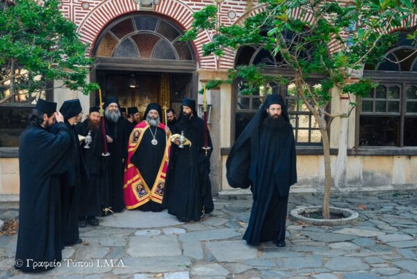 Κατά την διάρκεια της παραμονής του στο Περιβόλι της Παναγίας, ο Σεβασμιώτατος, προεξήρχε της Ιεράς Αγρυπνίας, επί τη ευκαιρία της εορτής των Αγίων Αποστόλων, η οποία πραγματοποιήθηκε εις το Καθολικό της Πατριαρχικής και Σταυροπηγιακής Μονής των Ιβήρων και εν συνεχεία ετέλεσε το καθ’ έτος τελούμενο Αρχιερατικό Μνημόσυνο επί τη συμπληρώσει δεκαέξι ετών από τη κοίμησή του μακαριστού, από Σάμου και Ικαρίας Μητροπολίτου Θεσσαλονίκης Παντελεήμονος Β΄ (Χρυσοφάκη), ο οποίος εκοιμήθη οσιακά στο Ιερό κάθισμα της «Παναγίας της Πορταΐτίσσης» την 9η Ιούλιου του 2003.