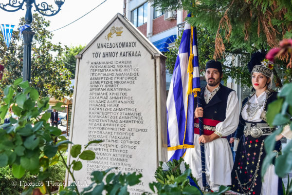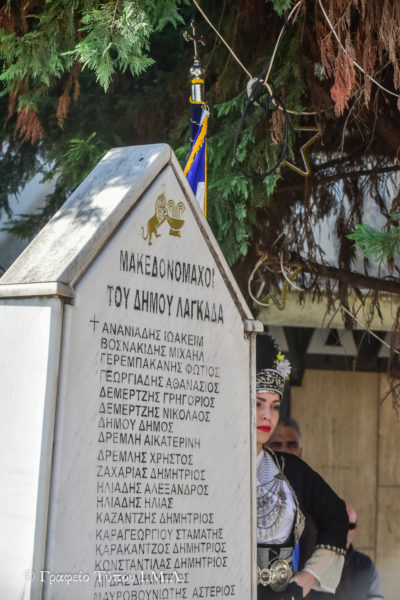 Μετά το πέρας της Αρχιερατικής Θείας Λειτουργίας, ο Μητροπολίτης Λαγκαδά μετέβη στο Μνημείο της προτομής των Μακεδονομάχων Λαγκαδά, το οποίο και ευρίσκεται στην κεντρική Πλατεία της πόλεως, όπου και τέλεσε Επιμνημόσυνη Δέηση, υπέρ αναπαύσεως των ψυχών των αγωνιστών πού θυσιάστηκαν κατά την περίοδο του Μακεδονικού Αγώνα, και εν συνεχεία πραγματοποιήθηκε η καθιερωμένη Κατάθεση Στεφάνων, παρουσία των Πολιτικών, Δημοτικών και των Στρατιωτικών Αρχών της Πόλεως και της Περιοχής.