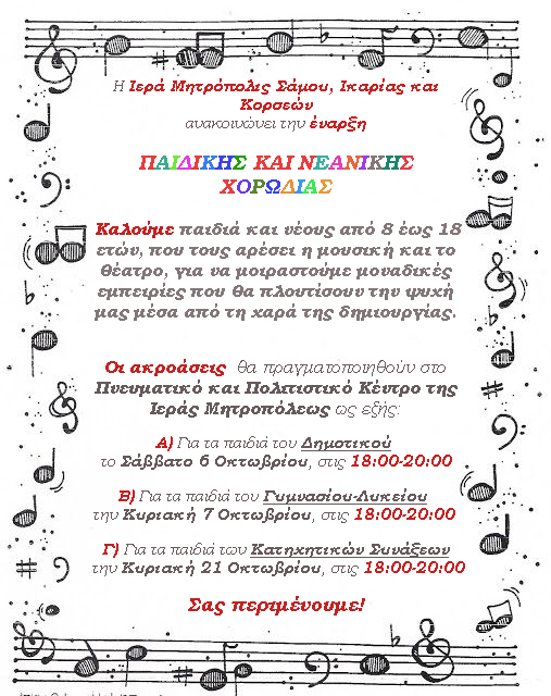 Με μεγάλη χαρά η Ιερά Μητρόπολις Σάμου Ικαρίας και Κορσεών ανοίγει φέτος τις πόρτες της και υποδέχεται τα παιδιά και τους νέους που θέλουν να συμμετάσχουν στα τμήματα της Παιδικής & της Νεανικής Χορωδίας.