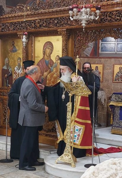 Στη συνέχεια απένειμε την ανωτάτη τιμητική διάκριση τής Ιεράς Μητροπόλεως, τον Χρυσούν Σταυρόν μετά της Εικόνος του Παντοκράτορος, εις τον διακεκριμένον Στρατιωτικόν – Ιατρόν και Συγγραφέα, κ. Αριστογείτωνα Χαραλαμπάκην με καταγωγή από τον Πύργο της Σάμου.