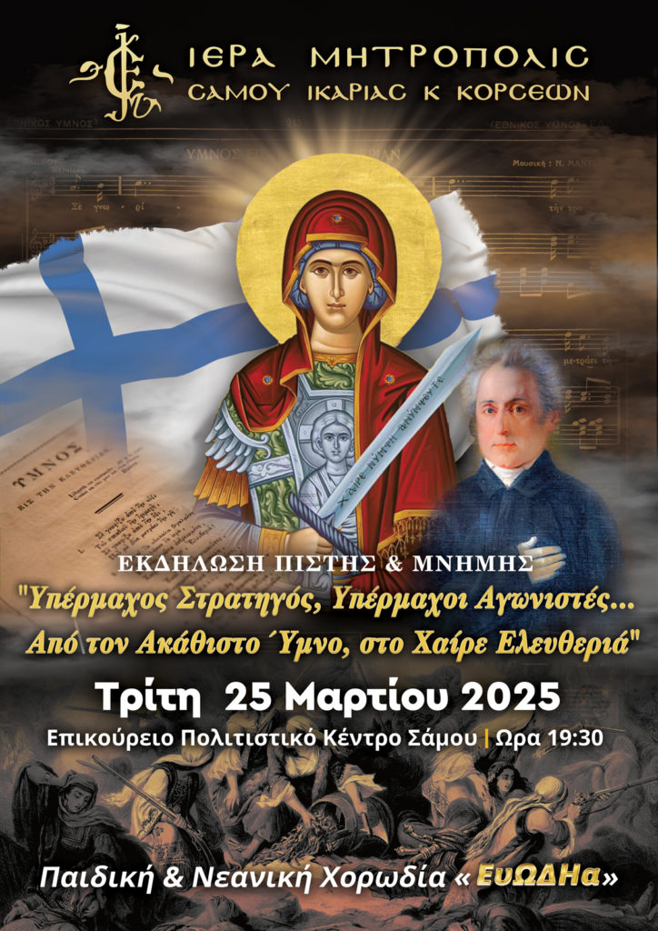 Μια ξεχωριστή εκδήλωση αφιερωμένη στην Παναγία και τον Εθνικό Ύμνο, με τίτλο: «Υπέρμαχος Στρατηγός, Υπέρμαχοι Αγωνιστές»- Από τον Ακάθιστο Ύμνο, στο «Χαίρε, Ελευθεριά», θα παρουσιάσει η Ιερά Μητρόπολη Σάμου και Ικαρίας, στο πλαίσιο του εορτασμού της Εθνικής Επετείου της Ελληνικής Επανάστασης του 1821. Εκδήλωση πίστης και μνήμης, αφιερωμένη στη Μεγάλη Μάνα και στους γενναίους υπερασπιστές της Πατρίδος.